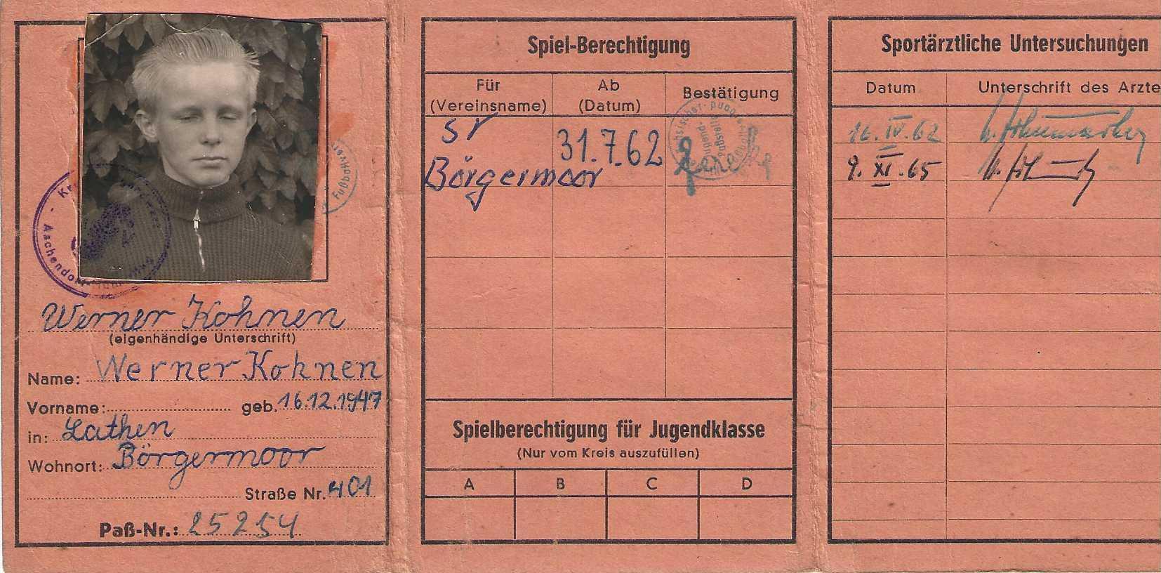 Nebenbei möchte ich meine eigene Suchtaktivität nicht vergessen: Auf dem Nachhauseweg machte ich einen kleinen Umweg zu Bäckerei Walker, und der hatte nach dem Krieg selbstgemachtes Eis. Es kostete 5 Pfennig. Für meine Großeltern war das eine Millionenausgabe, aber ich war und bin immer noch süchtig nach Eis. Und da ich nie kleinlich war, gab ich natürlich einigen von meinen Schulkameraden auch ein Eis ab, so lange die Geldbörse das hergab. Aber da waren nachkriegsmäßig natürlich ständige undefinierbare Kraterlöcher. Das hieß, hatte ich kein Geld für Eis, ging ich nach der Schulzeit noch eben mit meinem besagten Fußball auf den Fußballplatz von RaspoBörgermoor. Absprachemäßig mit meinen Schulkollegen noch eine Stunde Fußball spielen, meistens ich gegen 3-7 andere Kinder. Ich verlor auch wohl mal, aber meistens dann doch nicht. Das ging so weit, dass ich als Schüler schon in der Jugendmannschaft spielen durfte. I